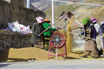 图为错那县觉拉乡罗堆一组群众正在用农机打场。