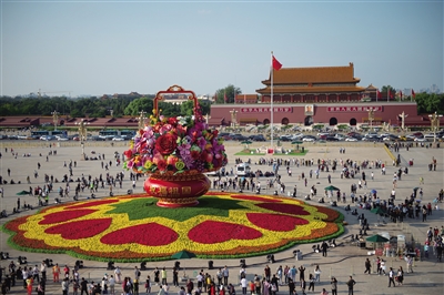 当日,“祝福祖国”大花篮主体完工,亮相天安门广场。大花篮顶高18米,篮内摆放有全国各地代表性“花卉”及富有吉祥寓意的“果实”,花坛底部则是由鲜花构成的10颗红心图案。大花篮计划于25日正式完工。