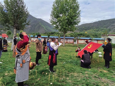 安绕镇哲姆村驻村工作队员嘎玛德吉和米玛说,“身为中华儿女,感到无上光荣、无比自豪!在平凡的岗位上的我要为村民过上更加美好的生活作出应有的贡献,切实履职尽责,为时代增辉、为党旗添彩。”