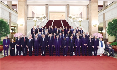 习近平首先同来华出席中国国际友好大会暨中国人民对外友好协会成立70周年纪念活动的部分外方嘉宾代表合影留念,对国际友人长期致力于对华友好事业表示高度赞赏。