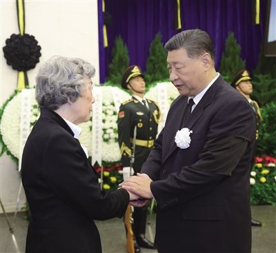10月14日,吴邦国同志遗体在北京八宝山革命公墓火化。习近平、赵乐际、王沪宁、蔡奇、丁薛祥、李希、韩正等前往八宝山送别,胡锦涛送花圈表示哀悼。这是习近平与吴邦国亲属握手,表示深切慰问。 新华社记者 鞠鹏 摄