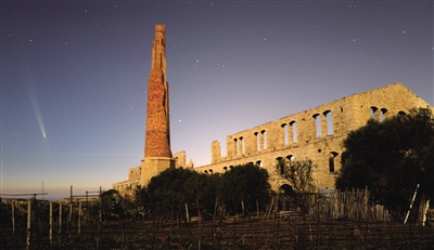 10月14日,在意大利西西里大区拉古萨省,紫金山-阿特拉斯彗星从一处历史遗址的上空划过。 新华社发(埃德加多·切鲁托 摄)