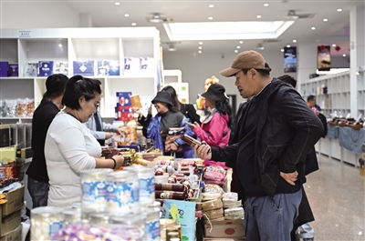10月14日,游客在策克口岸的中蒙边民互市贸易区选购商品。
