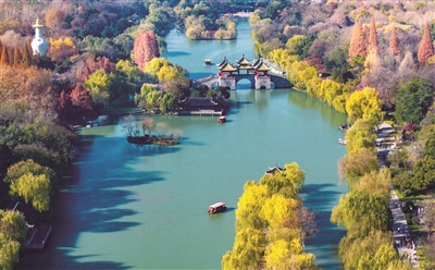12月16日,游客在江苏扬州瘦西湖风景区游玩(无人机照片)。 新华社发(周社根 摄)