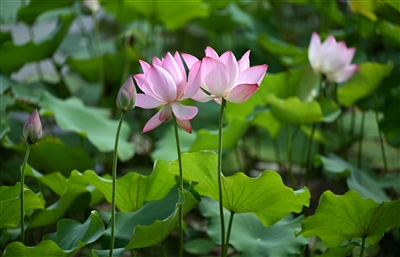 夏日里,海口市美兰区芳园村荷塘里的荷花盛开,吸引市民和游客前来观赏。