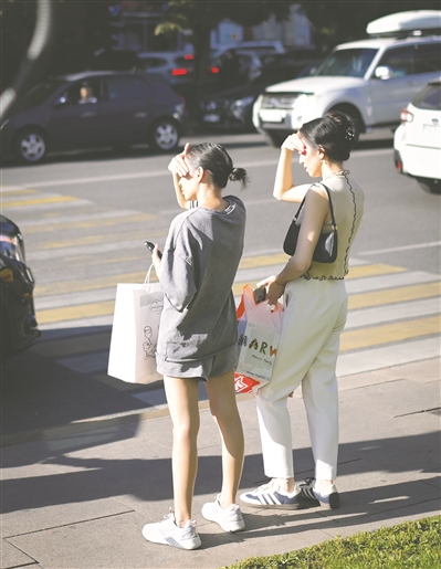 7月6日,两名女子顶着烈日在哈萨克斯坦阿拉木图街头等车。