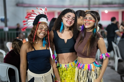 7月19日,在巴西里约热内卢的曼吉尼奥斯社区,身着特色服饰的女子在“丰收节”活动上合影。