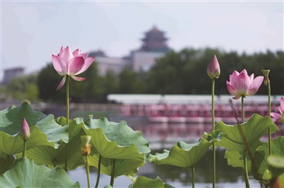 盛夏时节,北京的公园里荷花盛开,美不胜收。