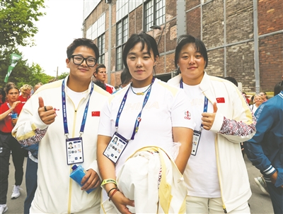 7月27日,中国链球运动员赵杰(左)、中国铅球运动员孙悦(中)和中国铁饼运动员姜志超在闭幕式后合影。