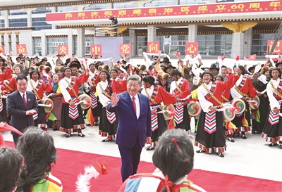 习近平离开西藏时,各族群众纷纷来到拉萨市区的沿途道路两旁,挥舞红旗、手捧哈达,欢呼着向总书记问好,向总书记表达由衷的爱戴。拉萨贡嘎机场,身着节日盛装的干部群众挥舞着红旗和花束,载歌载舞,高喊“扎西德勒”,表达高原儿女对以习近平同志为核心的党中央的感激之情、对建设社会主义现代化新西藏的坚定信心。