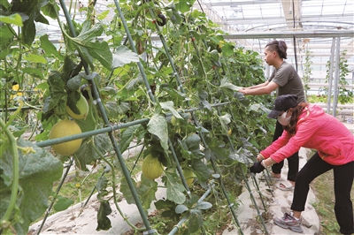 图为技术人员查看甜瓜生长情况。本报记者 益西旺姆 摄影报道