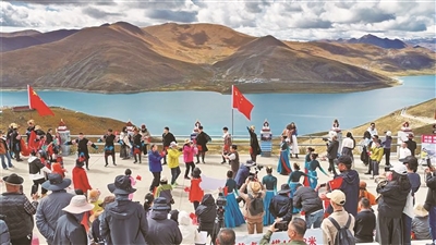图为在羊卓雍错,游客和当地群众跳起欢快的锅庄。 武沛涛 摄