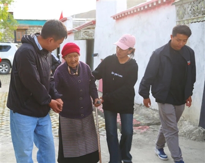 图为驻村工作队队员悉心搀扶老人行走。 本报记者 次旦卓嘎 摄