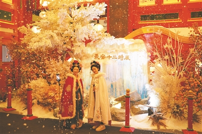 左图为12月23日,游客在街区以冬日长安雪景为主题的场景中拍照。