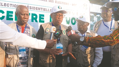 12月28日,在几内亚首都科纳克里一处投票站,西非国家经济共同体的观察代表接受媒体采访。