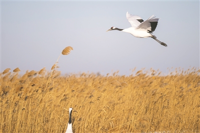 冬日时节,黑龙江扎龙国家级自然保护区内白雪皑皑,丹顶鹤在寒风中觅食,上演一幅鹤舞冬日的纯净画面。