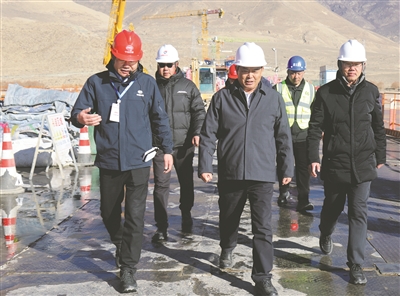 图为李富忠在萨热路跨江大桥项目施工点调研。 本报记者 白玛论珠 摄