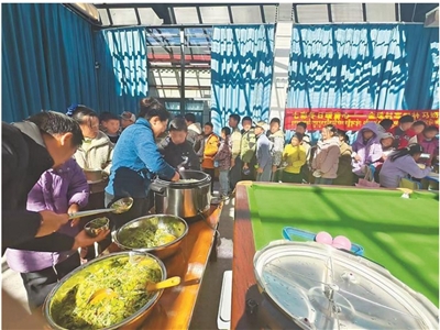 图为孩子们正在排队享用免费午餐。