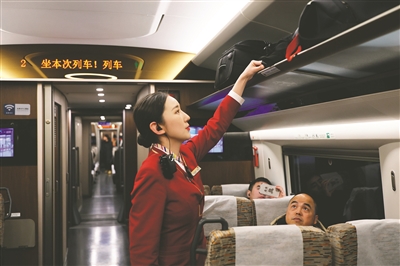右图1月26日,乘务人员在一列京津冀环线高铁列车车厢内整理行李。