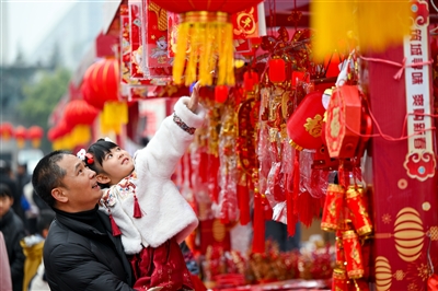 2月3日,家长带着小朋友在贵州省贵阳市筑城广场选购新春饰品。