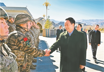 王君正强调,2026年是“十五五”开局之年,希望驻藏部队和武警官兵认真贯彻落实习近平强军思想和新时代军事战略方针,坚持党对人民军队的绝对领导,持续深化政治整训,加快先进战斗力建设,着力推进军民融合深度发展,践行人民军队根本宗旨,发扬优良传统,大力弘扬老西藏精神、“两路”精神,积极服务“四件大事”,争取更大光荣,为西藏长治久安和高质量发展作出新贡献。全区各级各部门要牢固树立国防意识和全局观念,更好支持国防和军队现代化建设,持续做好拥军优属服务保障工作,让大家“不为后路担心、不为后院分心、不为后代忧心”,始终做人民军队的坚强后盾和可靠后方。