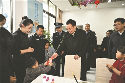 春节、藏历新年期间,2月18日,自治区党委书记王君正深入米林市重大项目建设现场、党群服务驿站、边境派出所,看望慰问坚守一线的基层干部和一线职工。这是王君正在南伊边境派出所给民警孩子发红包。