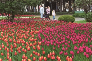 近日,位于阿塞拜疆首都巴库的海滨公园春意盎然,郁金香竞相绽放,吸引游客驻足欣赏、拍照留念。 新华社记者 陈俊锋 摄