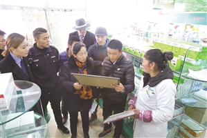 འདི་ནི་བརྟག་དཔྱད་ཚོ་ཆུང་གིས་གྲོང་ཁྱེར་གྱི་སྨན་རྫས་ཚོང་ཁང་ལ་བརྟག་དཔྱད་བྱེད་བཞིན་པ།