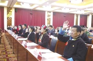 ཚོགས་ཆེན་ཐོག་གྲོང་ཁྱེར་མི་དམངས་འཐུས་ཚོགས་སྐབས་གཉིས་པའི་གྲོས་ཚོགས་ཐེངས་བདུན་པའི་འདེམས་བསྐོའི་བྱ་ཐབས་དང་། གྲོང་ཁྱེར་མི་དམངས་འཐུས་ཚོགས་སྐབས་གཉིས་པའི་གྲོས་ཚོགས་ཐེངས་བདུན་པའི་སྤྱི་ཁྱབ་འདེམས་ཤོག་ལྟ་ཞིབ་པ་དང་འདེམས་ཤོག་ལྟ་ཞིབ་པ། འདེམས་ཤོག་ཁྱབ་བསྒྲགས་བྱེད་མཁན་བཅས་ཀྱི་མིང་ཐོར་བརྡས་ཐག་བཅད་ནས་གྲོས་འཆམ་བྱས་པ། ཚོགས་ཆེན་གྱི་འདེམས་བསྐོའི་བྱེད་ཐབས་ཀྱི་གཏན་འབེབས་ལྟར་འཐུས་མི་ཡོངས་ཀྱིས་གྲོས་ཞིབ་གང་ལེགས་བྱས་པ་བརྒྱུད། ཚོགས་འདུས་མིང་མ་བཀོད་པའི་འདེམས་ཤོག་འཕེན་ཐབས་ལ་བརྟེན་ནས་ཁྲིམས་ལྟར་བསམ་གྲུབ་ཚེ་རིང་ལྷོ་ཁ་གྲོང་ཁྱེར་མི་དམངས་སྲིད་གཞུང་གི་གྲོང་སྤྱིར་འདེམས་བསྐོ་བྱས་པ་དང་། བློ་མཐུན་ལི་ཧྲེན་ཝུའུ་དང་། ཚའོ་ཙུའུ་ཡུས། ཚའོ་ཡུང་བཅས་གསུམ་ལྷོ་ཁ་གྲོང་ཁྱེར་མི་དམངས་འཐུས་མིའི་ཚོགས་ཆེན་སྐབས་གཉིས་པའི་རྒྱུན་ལས་ཨུ་ཡོན་ལྷན་ཁང་གི་ཨུ་ཡོན་ལ་བདམས་པ་རེད། དེ་རྗེས། རྩ་ཁྲིམས་ཀྱི་དམ་བཅའ་འཇོག་པའི་མཛད་སྒོ་འཚོགས་པ་རེད།