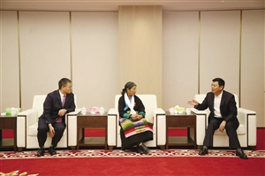 འདི་ནི་ལི་ཧྥུའུ་ཀྲུང་གིས“བདུན་གཅིག་བྱས་རྗེས་གཟེངས་རྟགས་”ཐོབ་མཁན་སྒྲོལ་དཀར་ལ་འཚམས་འདྲི་གནང་བཞིན་པ།
